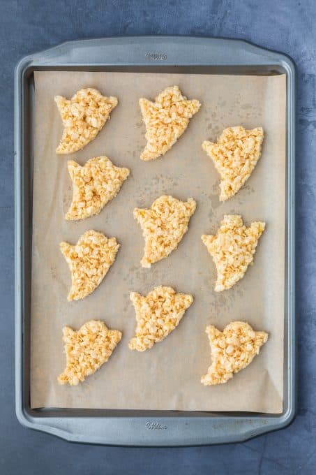 - Cut out the ghosts.ย Once the Rice Krispie mixture cools to room temperature, cut out the ghost shapes using a 3-inch ghost-shaped cookie cutter, removing them from the pan and setting aside. You should get about 10 treats.