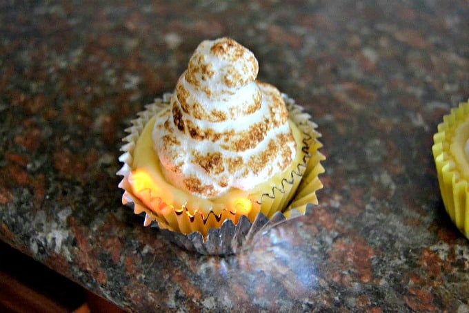 - Use a piping tip to decorate the cheesecakes and a hand-held torch to brown the meringue.